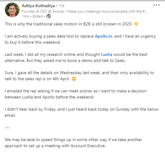 Adithya Kothadiya, the Founder of Avoma faced a painful sales process when he wanted to get onboard with a renowned sales intelligence solution.