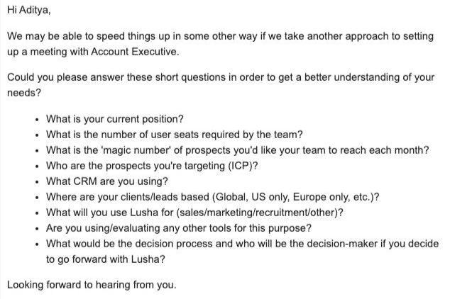The vendor asked him numerous questions, which are usually part of sales reps' research and emailed those questions to Adithya.