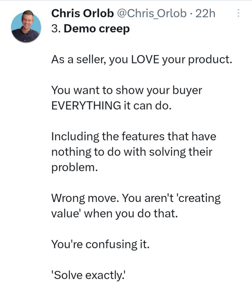 5/ Only then jump into screen sharing and this is where you have to be innovative and do a demo from the perspective of a solution this person is seeking. It's important to understand that whatever is cool about your software is only interesting from the perspective of solving their challenge and nothing else. Therefore showing features that they don't ask for is nice ... but is not a reason why they will buy. Why? Because your wonderful features often sound as "too good to be true".