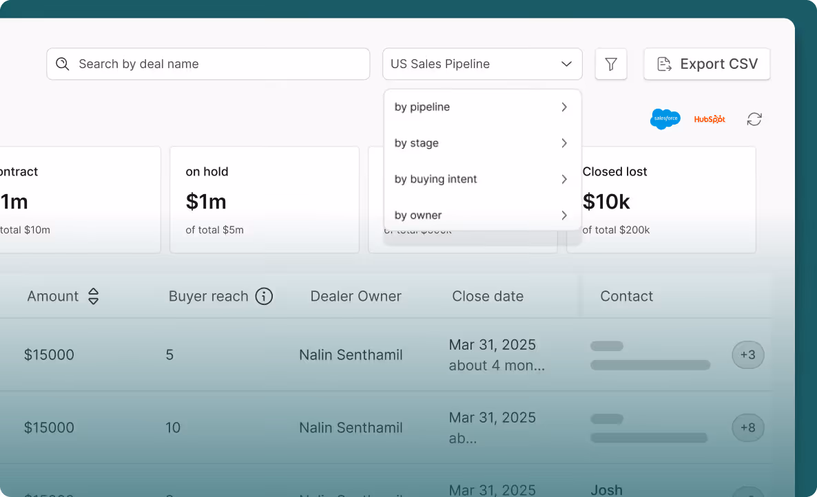 Filter by pipeline, stage, buying intent, or deal owner